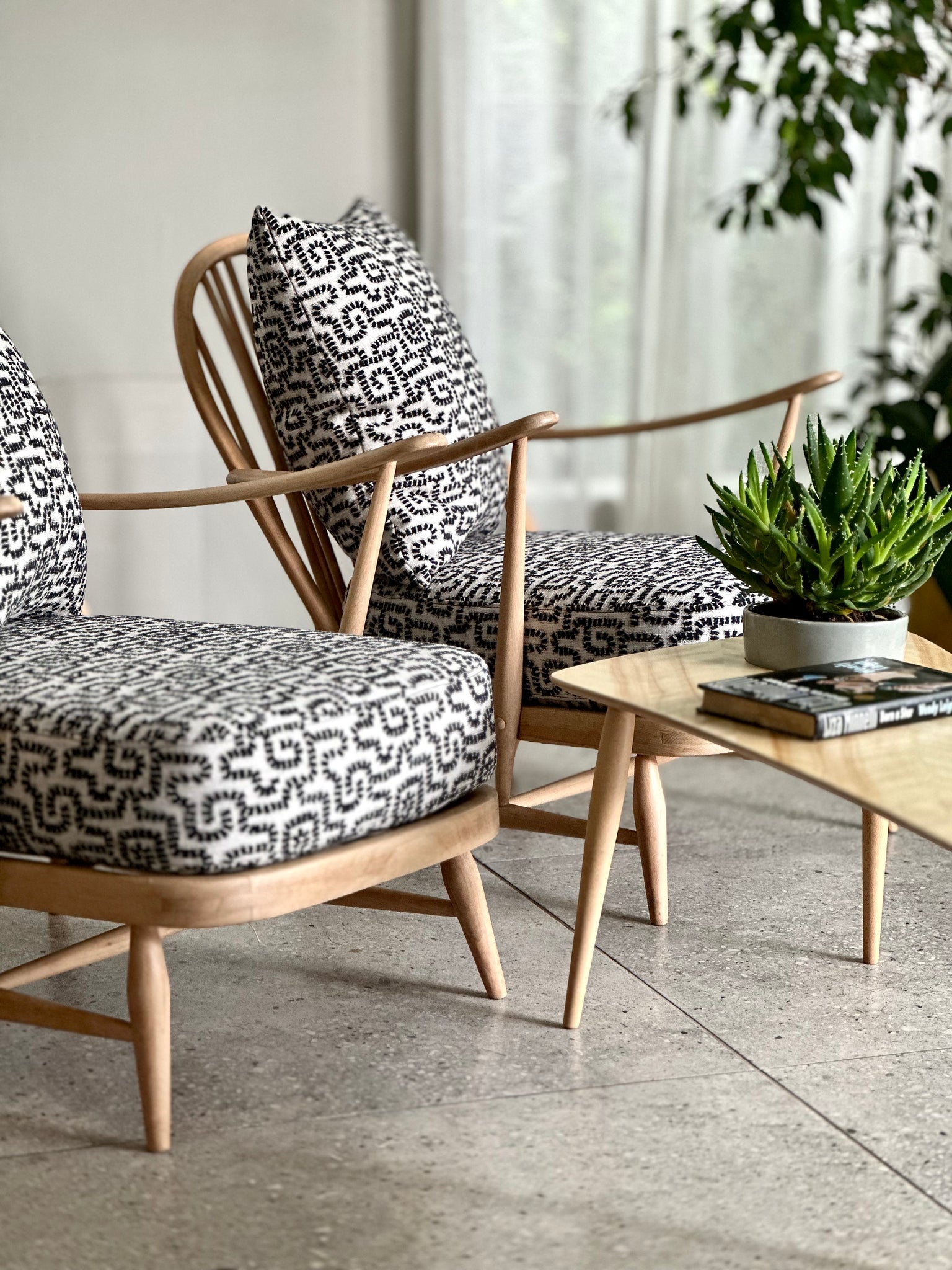 In a considered update to the original design language, the chairs are upholstered with a newly fitted seat cushion and a loose scatter cushion. This approach lightens the overall look while keeping the spindle back visually prominent.