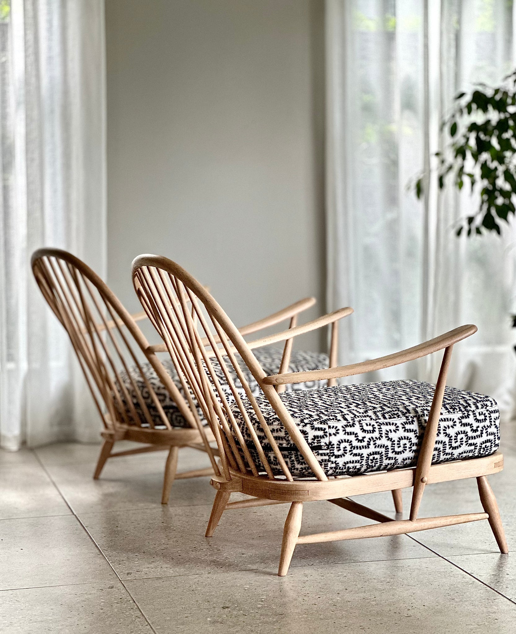 Both frames have been fully restored, carefully stripped of their darker stain to reveal the natural grain and tone of the oak, and resealed using a non-yellowing sealant to preserve the honest materiality of the wood. Structural enhancements have been completed to ensure the chairs are sound, comfortable, and ready for daily use.