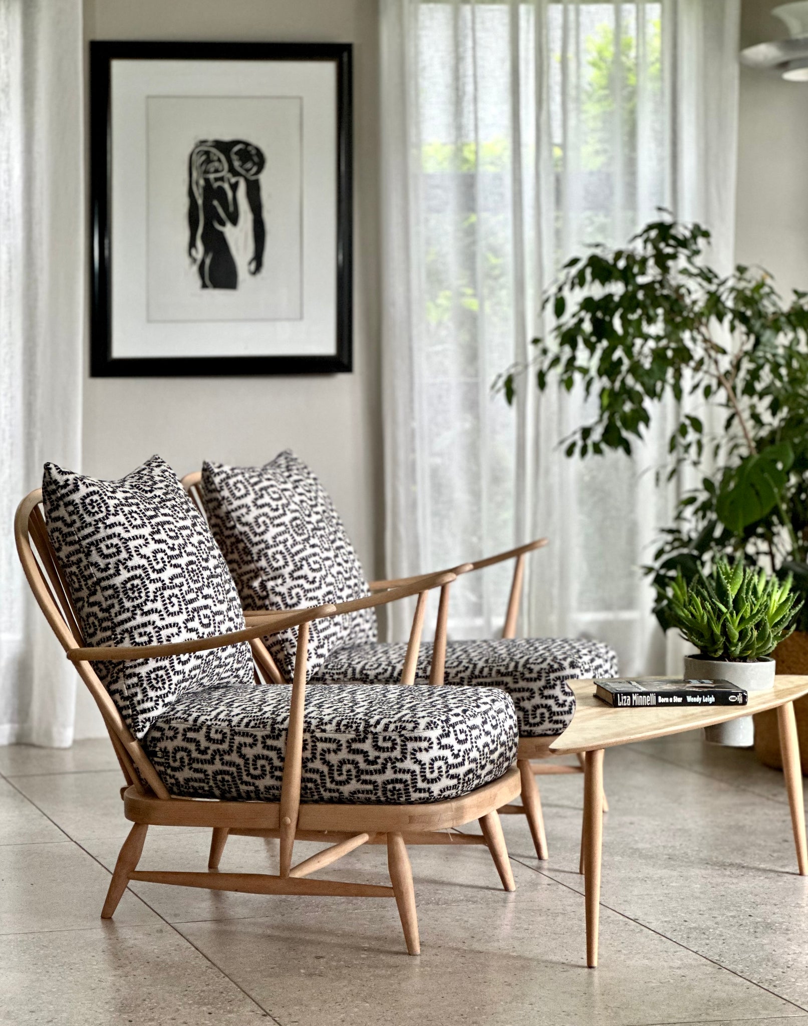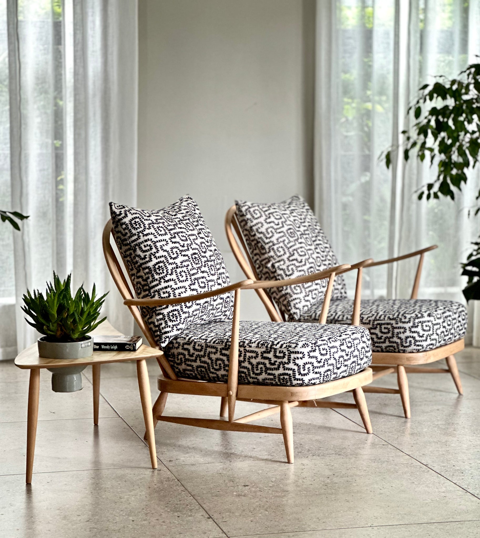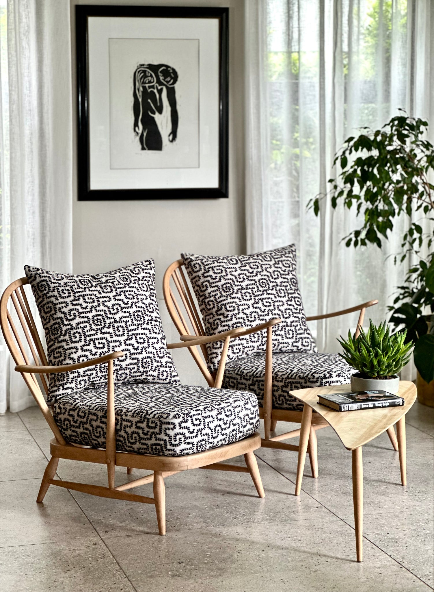 The upholstery is finished in a striking black and white textured fabric from Hertex, whose graphic pattern creates the illusion of a maze, adding depth, movement, and a contemporary edge to the otherwise classic form.