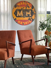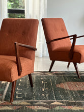 A Beautiful pair of armchairs with a clean, elegant design that will seamlessly fit into most interiors. The deep rust/ turmeric fabric accentuates the rich Mahogany tones of the frames, which have been fully restored, refurbished, and re-sealed. These armchairs offer both comfort and style, making them a timeless addition to any room.