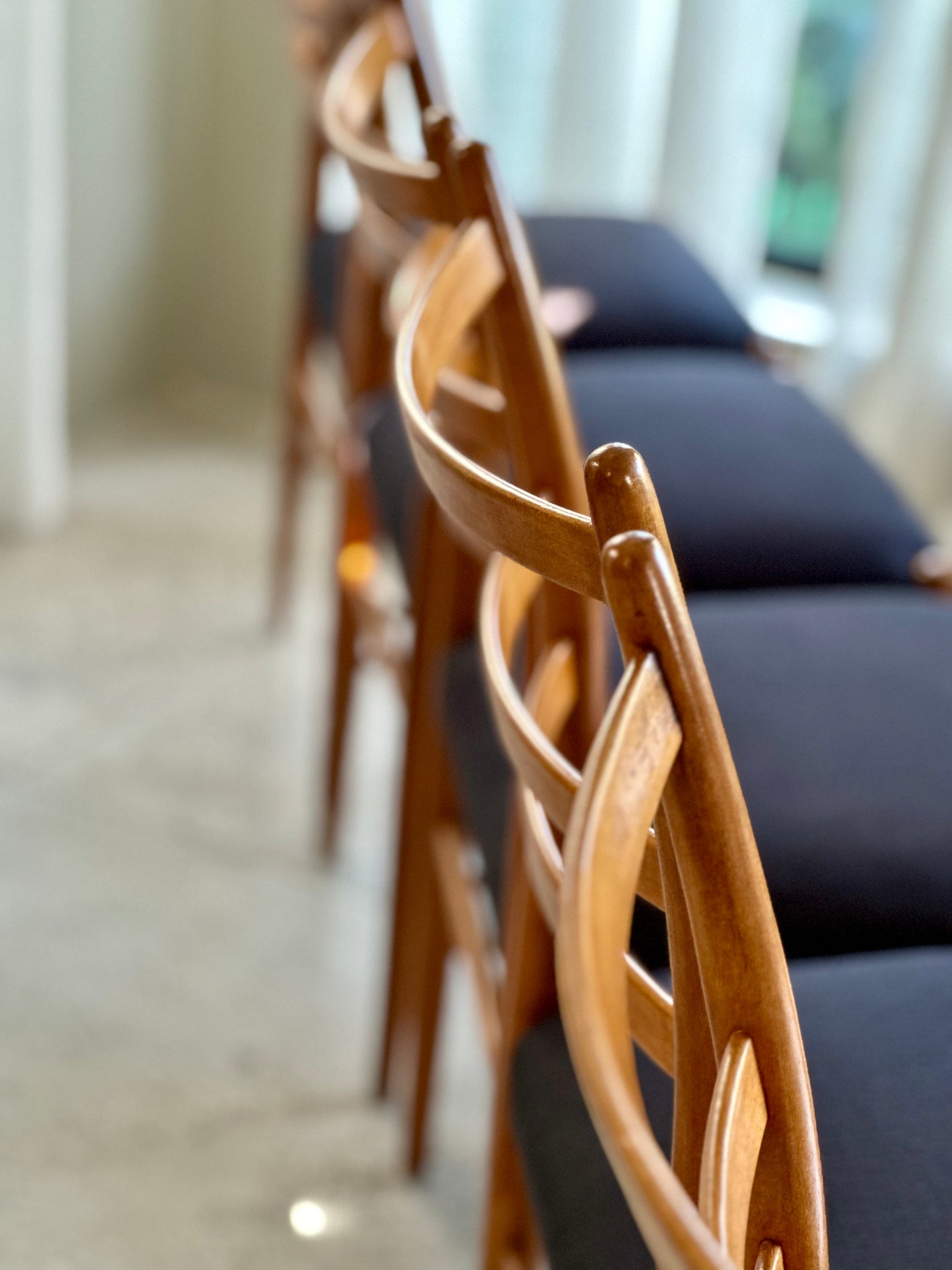 These "Gracell" chairs feature clean lines and a refined backrest silhouette that are hallmarks of Ekström’s design philosophy. Constructed from high-quality wood, the chairs showcase the natural grains, staying true to the mid-century modern ethos of incorporating natural materials. Their ergonomic form ensures comfort, with tapered legs and elegantly curved backrests that provide both stability and visual appeal.