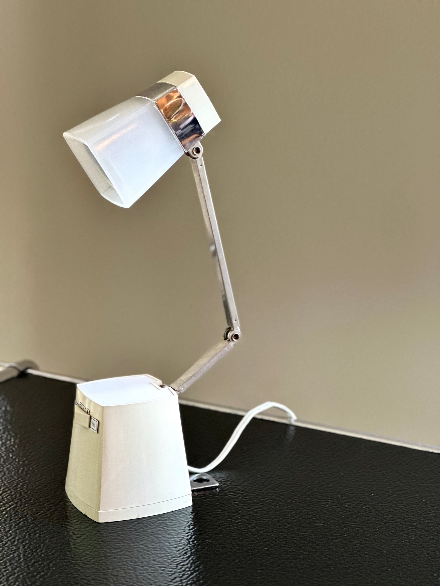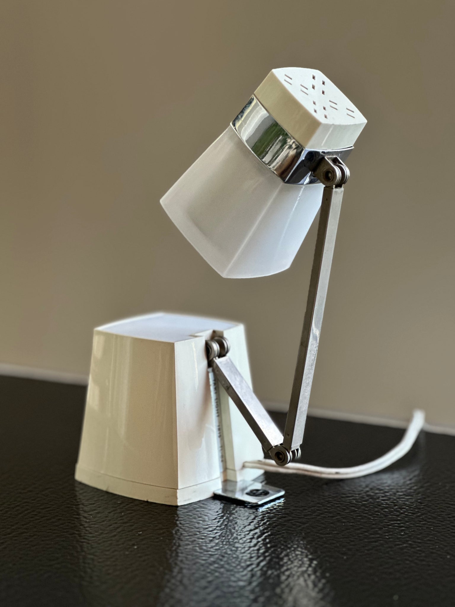 The lamp’s clever design allows for full adjustability — with two pivot joints on the arm enabling changes in both height and depth, while the head can be tilted and rotated for precise lighting direction. The weighted base incorporates a discreet wall-mount hook for versatile use, whether as a desk, bedside, or wall-mounted light.