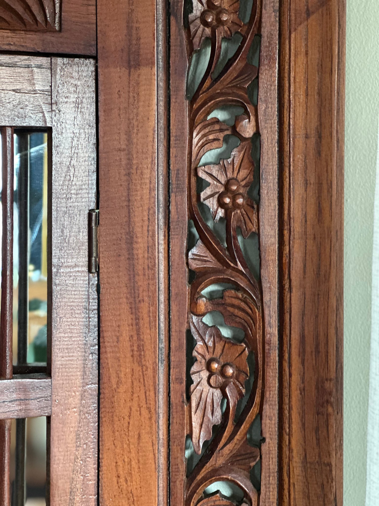 A Vintage Balinese Style "window" mirror that is known for its intricate design and exquisite craftsmanship. The combination of the wooden frame and the mirror behind the doors makes it a versatile decorative item. Its detailed carving and traditional aesthetic provide a beautiful seasonal backdrop.