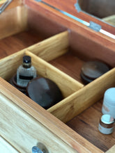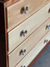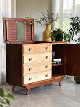 A functional Vintage chest in a variety of wood tones to compliment an eclectic interior. It features lift-top storage, a mirror, 3 drawers, and a shelved cabinet behind the door on the right.