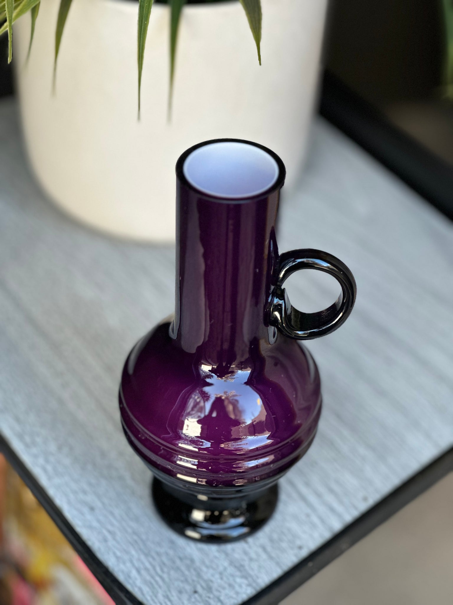 A striking vintage art glass vase featuring a rich grape-purple exterior contrasted by a smooth white interior finish. The design is elegantly sculpted with a rounded base, ribbed midsection, and a slender neck accented by a small loop handle. Beautifully reflective with deep tonal depth, it makes a bold decorative accent — perfect as a single statement piece or part of a glass collection.